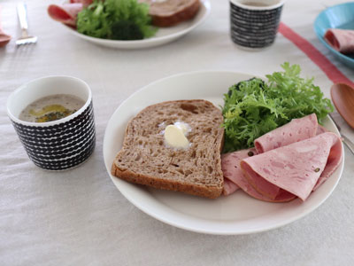 忙しい朝はワンプレート朝食で盛り付けも洗い物も少なくしたい!そんなときにこのプレートが便利! 食パンもはみ出ず、サラダやおかずをバランスよく盛り付けられます。