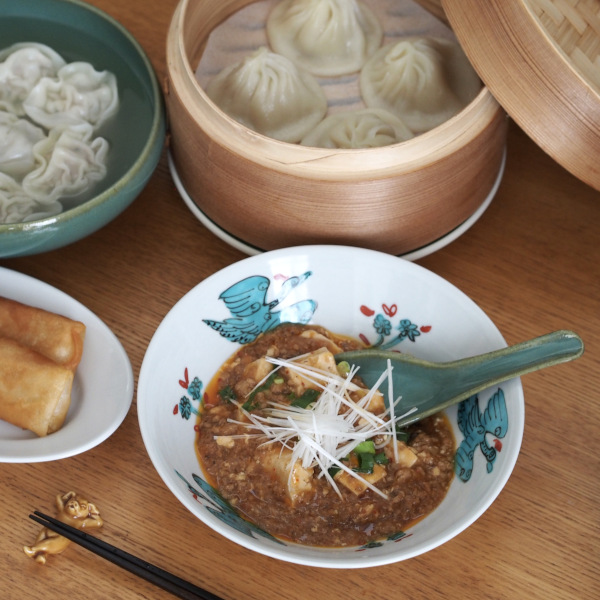 横井さんの器を選ばせてもらいに行ったときに一目ぼれしたのがこの鳳凰と鳥の器。この器を見た瞬間に麻婆豆腐を盛りつけたい!!と思い実際に盛り付けてみたのですがこれが大正解。以前店長ミサコが水餃子を盛り付けていましたが、それも相性バッチリ◎こんもりと炒飯を盛り付けてもいいし、エビチリとかも似合いそうです。大きさとしては19cm弱と取り回しが良く、深さもあるので汁気の多いものでも大丈夫な万能選手です。一つこういった柄物を置くだけで、テーブルの上が明るくなりますね。