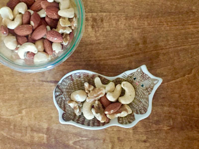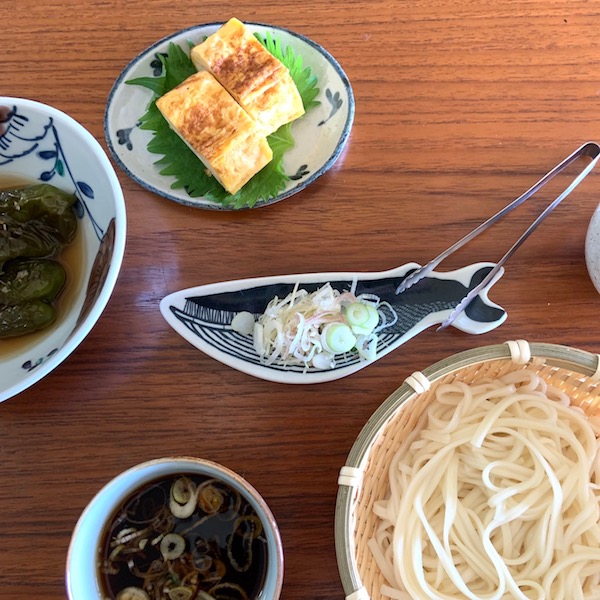 変型皿、しかも顔つきのため買った当初は何をどう盛り付けたら可愛くなるのか迷いましたが、kata kataの器はあまり悩まず使うのが正解のようです。小さなクジラの豆皿にはカリカリ梅、ちりめんじゃこ、塩辛などのごはんのオトモをひとくち分ずつ。小腹対策のナッツ。麺類や鍋料理の時はもみじおろしなどをのせて使っています。この日のおひとりさまランチは「ひやあつ」の稲庭うどん。欠かせない追い薬味をひとり分盛り付けるのに良きでした。