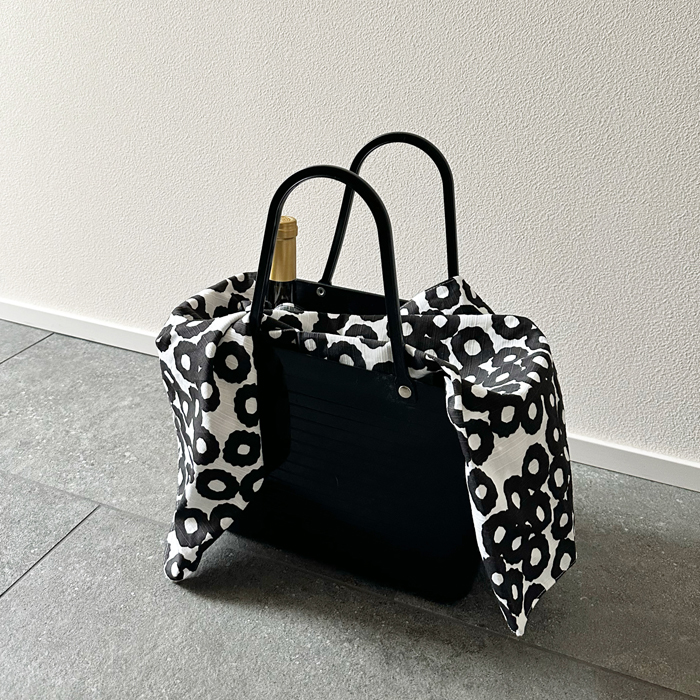 「ほっこり」と名付けられたこのパターンは、軽井沢にアトリエを構え、障がい者の就労支援をされている「チャレド」のクリエイターさんによる切り絵作品から制作されました。シックな墨色のパターンは京都の「むす美」に風呂敷へ仕上げていただきました。生地は高級感と張りがあります。私はお買い物バッグの目隠しにしたり、カバンに忍ばせいざという時はエコバッグにして使っています。和風、北欧風、モダンとも合うのでインテリアや服装を選ばないところがとても気に入っています。