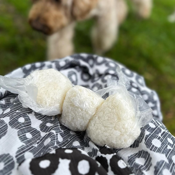 お天気が良ければ週末はなるべく犬を連れて犬友のところへ遊びに行きます。お昼ご飯はおにぎりぽっけで「おにぎり」をむすび、風呂敷「ほっこり」に包んで持参。遊び回っている犬たちを眺めつつ、いただきまーす!最近は炊いたご飯が余るとすぐおにぎりにしています。炊き立てのご飯で作ったおにぎりは翌日でも美味しいな。今日のおにぎりは家族が作ったので裸の大将に出てきそうな大きな梅干しおにぎりでした。肉食の犬たちは無関心なのでゆっくり味わいました。