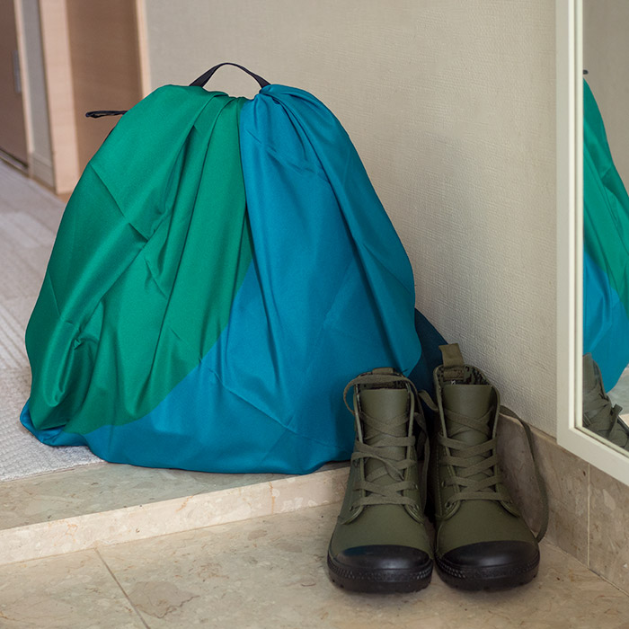 近年の夏はゲリラ豪雨など突然の大雨に見舞われることもあり傘だけでは心もとない日も増えました。そんな時に頼りになるのが、むす美のアクアドロップです。この風呂敷は撥水性に優れ、コンパクトに畳めるので持ち運びにも便利。普段はジム帰りの濡れた衣類を包むのに使っていますが、この季節は外出時にバッグに忍ばせておくと安心です。急な雨もバッグをアクアドロップで包んでしっかりとガード。水を運ぶこともできるほどの撥水力で、ちょっとした雨はもちろん、大雨でも活躍してくれます。不安定な天候の日のお守りとして、おすすめです。