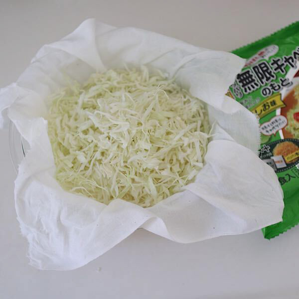 最近我が家ではまっているマルちゃんの「パリパリ無限キャベツのもと」。粉末スープとパリパリ麺がセットになっていて、千切りのキャベツに混ぜるだけで簡単にできちゃうし、とにかく子どもがもりもりキャベツを食べてくれるので野菜が足りない献立のときの救世主です!ただし、この無限キャベツをおいしく作るコツは「水気をしっかり切ること」。少しでも水気があるとパリパリ麺がしなしなに・・・これではおいしさが半減してしまいます。そこでこのさらしが大活躍!水洗いしたキャベツを包んでギュギュっとすれば水気もしっかり取ってくれます。これで無限キャベツの味もしっかり決まり、キャベツ半玉は軽く食べられますよ。