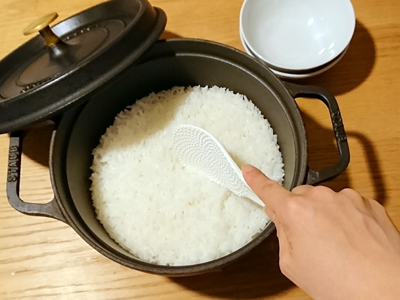 家族が「炊飯器より美味しい!」と喜んでくれるので、去年の夏くらいからお鍋でごはんを炊いています。我が家はラウンド22cmで2合炊きますが、容量的には余裕があります。ストウブで炊くと土鍋よりしっとり炊きあがるように思うので、少し長めの時間設定にしています。