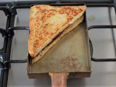 食パンを斜めに半分に切って、塩こしょうで味付けした卵液に浸してフレンチトーストにしましたが、この玉子焼鍋がぴったり!銅なのでふんわり焼けて、最後に間にハムとチーズを挟んで焼いたらチーズがとろり。甘くないフレンチトーストは朝食にいいですよ。