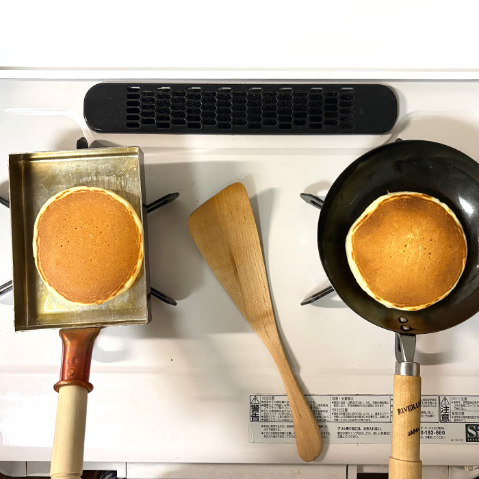わが家の玉子焼き器は鉄製です。十分それで満足していましたが、店長みさこに銅板で焼いただし巻き玉子はふわっふわで全く違うからと言われ、サンプルを借りて作ってみました。厚焼き玉子ではなくだし巻き玉子を作るのも初めてでしたが、娘曰く「お寿司やさんのと同じ味」と大成功。卵液が全くこびりつかないのが不思議です。銅板といえば...と翌朝ホットケーキも焼いてみたところ、見てください!右側の鉄フライパンに比べ焼きムラが全くなく、こんなにも綺麗に焼けました。これは買うしかないかなー。
