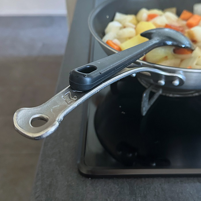 シルクフライパン(キングフロン)の好きなポイントをあげるとしたら「ステンレス柄」。コレがとっても機能的です。熱くなりにくいので素手で扱えるのはよく知られていると思いますが、私としてはお気に入りポイントがもうひとつあります。柄の窪みとカーブが絶妙で「菜箸やシリコンスプーンをちょこんと置ける」んです。計算されているのか偶然なのか分からないのですが…調理中手を離したい時とか、何度もかき混ぜたい時に柄を自然と使っています。