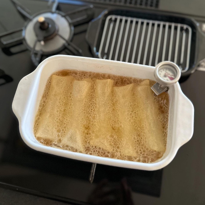 こちらの揚げ鍋は、私の大好きな春巻きを綺麗に5本並べて揚げられます。コンパクトですが小さすぎないのも良いポイント!また、丸底だと案外デットスペースが生まれるんですよね。そしてそして痒いところへ手が届くセット内容も秀逸!温度計やバットが付くのはとっても便利。お料理初心者やキッチンのコンパクト化をしたい方にもおすすめ。また油の様子がよくわかる白いホーロー製なので気持ちよく使っていただけます。IH対応なのでテーブルで串揚げパーティーもいいですね。
