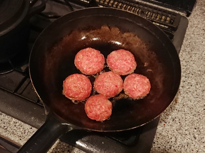平底タイプの中華鍋をフライパン代わりとしても使っています。合いびき肉を300g使って作ったハンバーグを一度に全部焼いても余裕がある!鉄は熱伝導率がよくてふっくらジューシーに焼きあがりますよ。