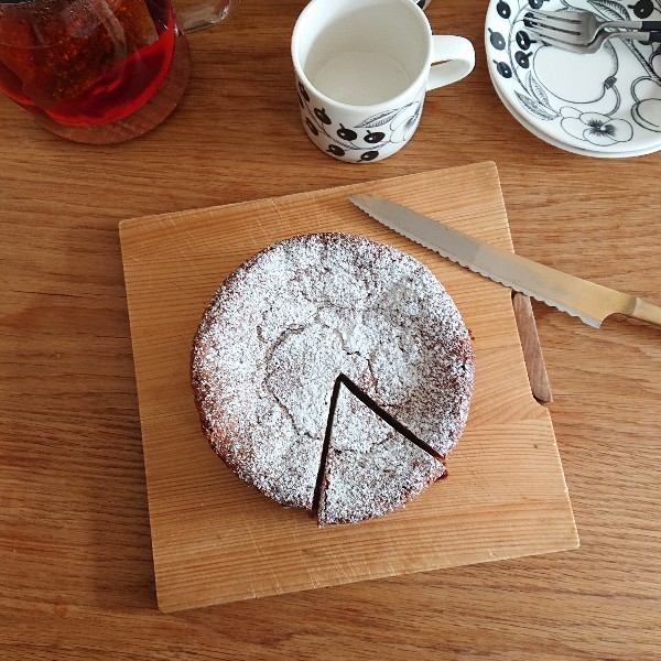 土佐龍のまな板をカッティングボードとして使い始めて6年以上経ちました。スタンド付きで立てて保管できるのでトースターの横定位置です。パンやケーキ、ピザなどなんでもこのまな板で切っちゃいます。パン切り包丁といっしょに使うためご覧の通り傷だらけですが、長く使い続けるからこその味わいがお気に入りのポイントです。今年のバレンタインはクリスマスに作って好評だった志麻さんレシピのガトーショコラをもう一度。生クリームたっぷりにしていただきます♡