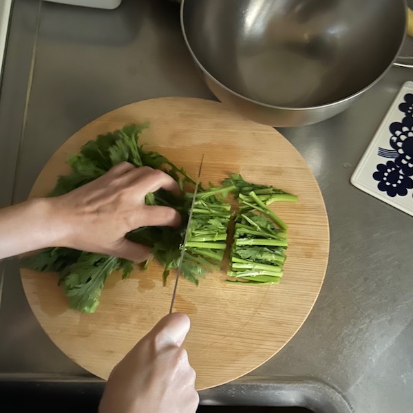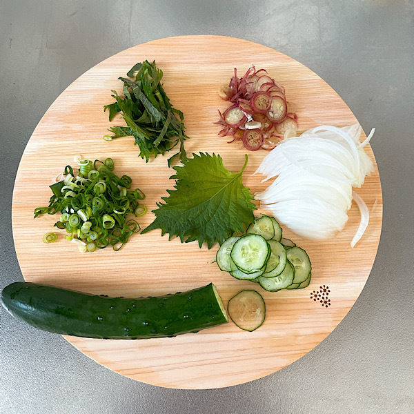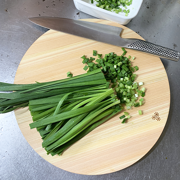 丸いまな板を使うのは初めての私。長方形の方が省スペースかと思い込んでいましたが、大違い!食材を移し替えるお皿やボウルをいくつも並べるより、このまな板の上で完結できます。切った食材を置いたまま、くるりと回転させれば、次の食材をカットすることで出来るんです!これは使いやすい。初夏に向けて薬味を色々とたっぷり切るときにもおすすめです。