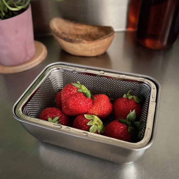 家事問屋のコンパクトさは我が家の食生活にジャスト過ぎ。このスタッキングザルと角バットのセットはミニトマトを洗ったり、豆腐やヨーグルトの水切りに出番多しですが、よく購入する使い切りサイズの野菜や少量パックの果物の水洗いをするときにも重宝します。この日はいちごの少量パックを。あまおう7個が仲良く水浴びできました。大は小を兼ねるというけれど、わたしはやっぱりジャストサイズが断然使いやすい!将来、暮らしがコンパクトになったときにも活躍してくれるはずです。