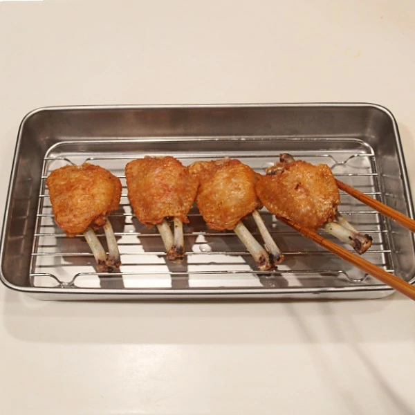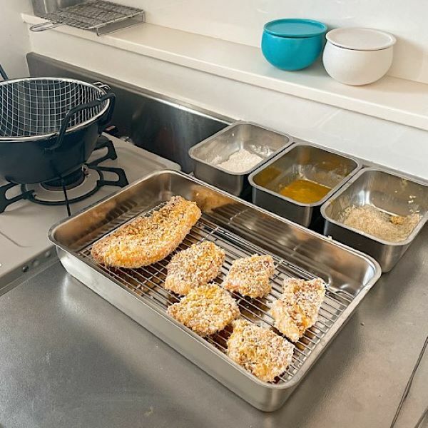 下ごしらえに使ったり、ちょびっと切った食材をスタンバイさせたりするのにも活躍するスリムバットですが、スリムバット用アミを組み合わせて少量の揚げ物を休ませておくのにも便利です。何よりも、名前の通りスリムなので通常のバットよりも場所を取らないのが私的グッドポイントです。1~2人分のお弁当用のちょっとした揚げ物にもってこいなサイズです。