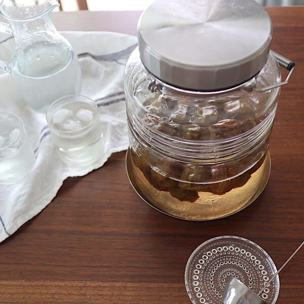 数週間前に漬け込んでいた梅シロップが出来上がりました!瓶に移し替える前にちょっと味見をと何度か蓋を開け閉めしていたらシロップが垂れて底がべとべとに。保存瓶はアデリアグラスのメタルキャップコンテナー3Lを使用していますが、このまる型トレー19㎝に乗せてみたらジャストフィット!氷砂糖を解かすために瓶をゆすっていると蓋を開けたときにシロップが垂れやすくなるようです。でも、このトレーを受け皿にしてからはちょっとくらい垂れても大丈夫!・・・と安心して味見をしていたら移し替える前にだいぶ少なくなりそうです笑