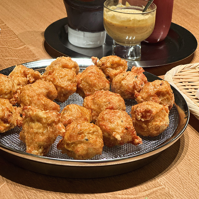 家事問屋の「まる型トレー」にピッタリサイズの「盆ザル」を組み合わせると、揚げ物メインの食卓が盛り上がります。丸型なのでテーブルでもお皿のようにレイアウトしやすく、揚げたて熱々をドンと置けば「わーい」と大人もはしゃげます。金網なので水分が抜けやすく、サクサクが長続きするのも美味しさポイントUP!この日はスパイスを効かせたチキンボール。ハニーマスタードにケチャップにバーベキュー…ソースの種類も色々と準備してビールと一緒に気合を入れていただきます。