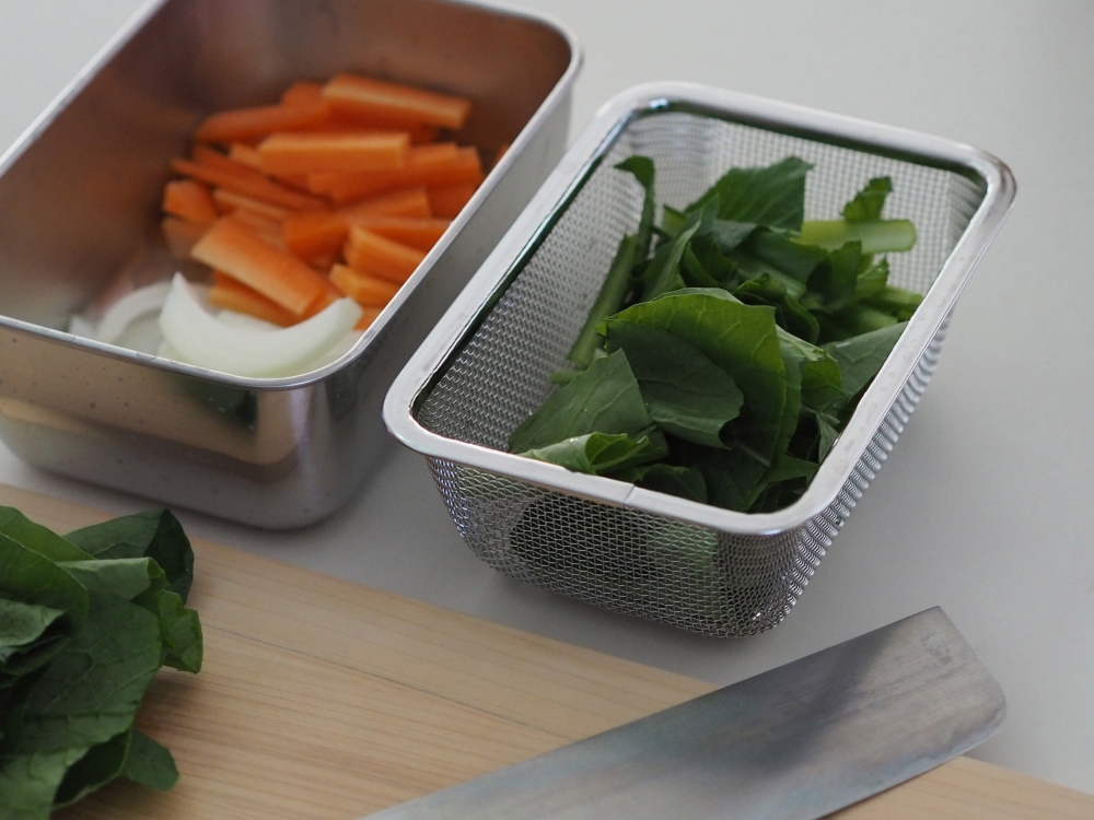 具だくさんのスープやお味噌汁をつくることが多いので、野菜の下ごしらえにちょうどいいサイズです。今まで丸いボウルとザルを使っていましたが、長方形は狭いスペースでも使いやすいです。仕舞っておくときもスペースを取らないので小さなキッチンに最適です。とても便利なのでもう一組買い足そうと考えています。