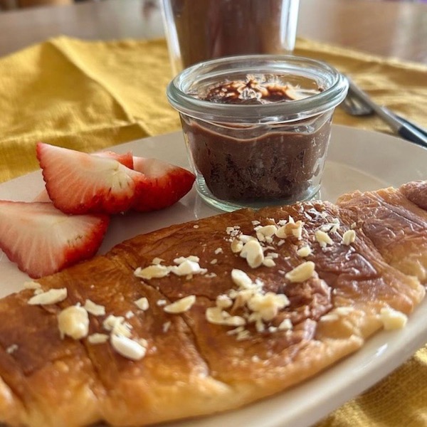 ビターの板チョコ2枚とたまご3個で作るチョコムースを時々作ります。元のレシピはタサン志麻さんので、本来は砂糖も使うのですが、甘さ控えが好みのため砂糖を使わず作っています。今日はクルンジという韓国で流行っている薄型クロワッサンに、家にあったいちごやナッツをトッピングして、チョコムースはウェックの小さいサイズに。気分だけはカフェ風。インドア派の我が家で盛り上がるおやつタイムです。チョコムースはそのまま食べてもパンにつけても美味しい~。