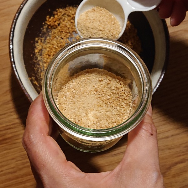 ハワイへ行ったときスーパーに好きなナッツを選んで自分でナッツバターを作る機械がありました。ナッツバーターは購入するものと思っていた私はびっくり。それを思い出して家にアーモンドがあったので蜂蜜をちょっと加えてフードプロセッサーでグィーンとやってみました。ナッツバターと呼ぶには粗めになってしまいましたが素朴な味がおいしい。ウェックのキャニスターに入れるとちょっと可愛く出来た気がして自己満足です。