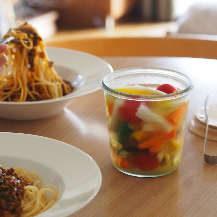 平日に楽をしたいので、週末に何品かつくり置きをしています。料理で余った野菜を刻んでピクルスを作ってみました。ピクルス液は「かんたん酢」に月桂樹の葉をプラスした、まさに簡単なもの。余った野菜を使ったので、これくらいの瓶がちょうどよいサイズ感です。今日は娘の大好物のミートソースと一緒にガラス瓶のままドーンと食卓へ。色鮮やかな野菜が透けて見えて食卓を鮮やかに彩ってくれました。実はミートソースも週末つくり置きのもの。今日は温めるだけで豊かな食卓になりました~!