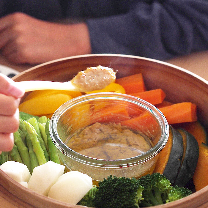蒸し料理が美味しい季節がやってきました。せいろに野菜をカットして入れるだけですが、鮮やかな自然の色のお陰で、見た目が華やかな蒸し野菜はわが家の鉄板料理です。野菜がもりもり食べられますよね。せいろの中央には作り置きのバーニャカウダのソースを置き、野菜と一緒に温めてしまいます。余ったソースはそのまま蓋をして冷蔵庫へIN。WECKは冷蔵も温めもOKで別売りで蓋もあるのでこういう時に助かります。ちなみに使用した中華せいろは27cm(内径23cm)です。