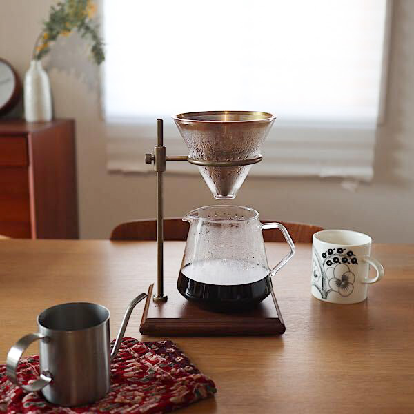 コーヒースタンドはとにかくシンプルで見た目が素敵なものをずっと探していましたが、これはまさに理想のコーヒースタンド!土台はこっくりとした色味のウォールナット材、シックな真鍮のスタンドはかっこいいだけでなく可動式なのでカップに合わせて調整が可能です。さらに嬉しいのがステンレスフィルター。紙フィルターを切らしてしまって慌てることもありません。かっこいいだけじゃなく機能性も問題なし!食卓に置いてゆっくりとコーヒーを淹れるのが楽しくなる、そんなアイテムです。