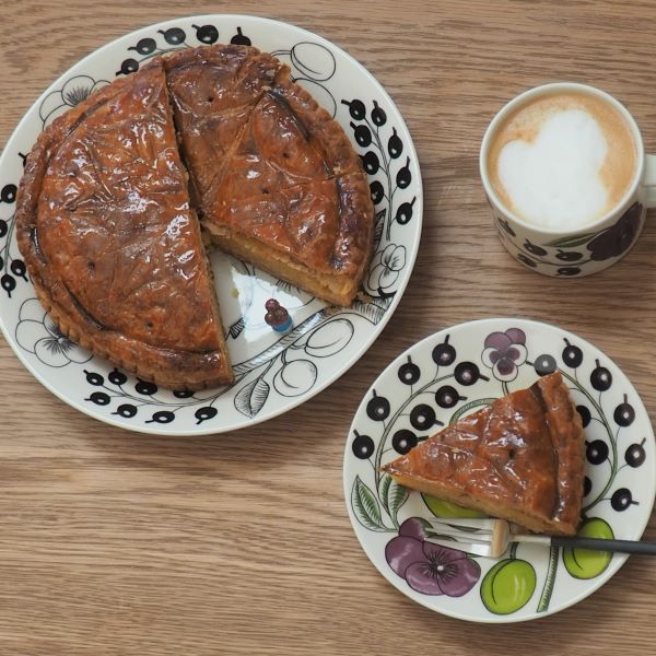 フランスの新年のお祝いに楽しむ「ガレット・デ・ロワ」。残念ながら家族が全員揃う時間が取れず、切り分けて食べました。フェーブは別添えだったので、自分で入れるのですが、息子が「こんなの入ってたら歯が折れる」というので、入れずに食べました(笑) まったくもって意味を成していなかったけど、美味しかったので良しとしましょう!26cmの大きなプレートは、ホールケーキのお皿としても使え、パラティッシの柄も華やかさを演出してくれますね。取り皿には他のカラーで更に華やかに。