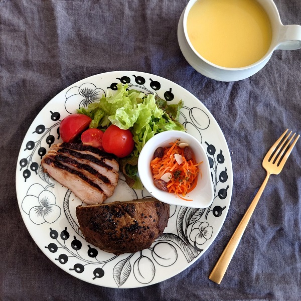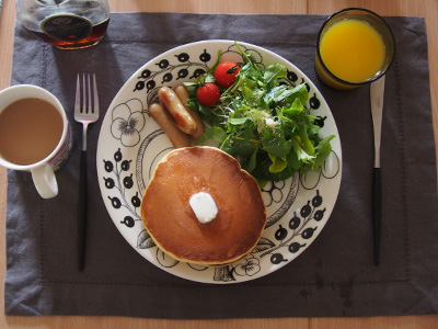 「今日は上手に焼けたよ!」と夫の声。わたしのホットケーキ好きがうつったのか、休日の朝食はよく夫がホットケーキを焼いてくれます。柄もので一見華やかですが、モノトーンなので食材を邪魔しません。朝昼夜と一番活躍しているプレートです。