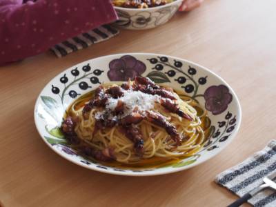 これ一枚で華やかな食卓を作り上げてくれるパーパラのプレート。一気に気分が上がります。この日はホタルイカのパスタ。旬の味覚を頂きます。フラットではなく少しリムに立ち上がりがあるので、ソース系のパスタでも零れることなく安心。カレーもハンバーグなどのメインディッシュも何でもござれの26cmプレートです。