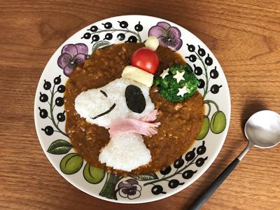パープル パラティッシはクリスマスの食卓を厳かで華やかにしてくれます。スヌーピーの色どりが寂しかったのですが、瑞々しい絵柄が補ってくれました。カレーもごちそうに見えますね!