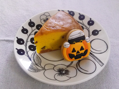 かぼちゃのケーキをモノトーンのブラパラに乗せてハロウィンな気分!クッキーの力かな(汗)。この季節になると思い出す友人のこと。「ハロウィンの掛け声…えっと…あ!ノー・モア・ウォー!」 違うけど、それもいいかもって思えるエピソードです。