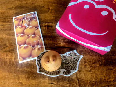 お土産にいただいた可愛いカエルのお饅頭。こんな時に使いたくなるのがこの猫の豆皿です。お饅頭をのせられて心なしか猫が戸惑っているように見えるのもおもしろく、思わず写真に撮ってしまいました。他にもいろいろのせてみたくなりますね!