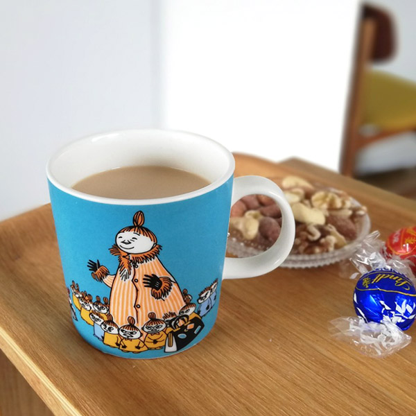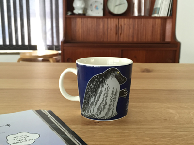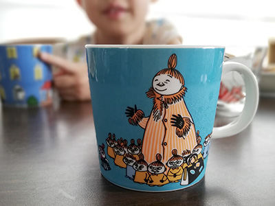きれいなターコイズブルーにおかあちゃん感あふれるミムラ夫人の笑顔。大好きなマグです。後ろのイラストは、走る子供たちを追いかける夫人の姿。ちょっと待って~と声が聞こえてきそうで、これには共感しかない。今さらながらよく見たら、夫人のマフラーがキツネのような動物!細かい書き込み、見逃していました。