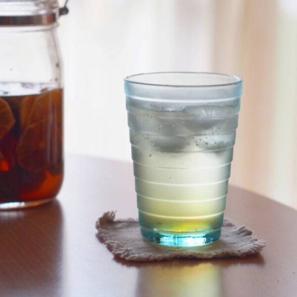 適量って人それぞれ違いますが、私の適量はアイノのハイボール。小さ過ぎず、大き過ぎずでちょうど良いサイズ感なんです。このボコボコした側面のおかげで結露していてもツルッといきにくくて安心。涼やかなウォーターグリーンのグラスには炭酸の泡がよく似合う!