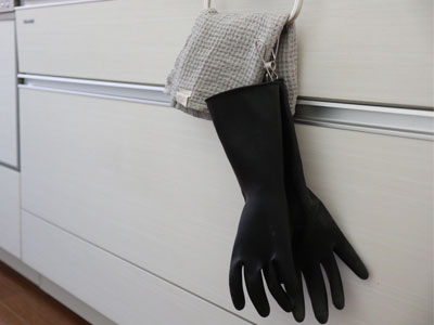 キッチン周りをシンプルにしたくて、黒のゴム手袋にしてみました。ガーデニング用だけど、これがなかなかいい!見た目はもちろんかっこいいし、何より丈夫なので長持ちします。お気に入りのリネンテイルズのタオルと一緒に並べると、統一感が出てすっきりした雰囲気になりました。