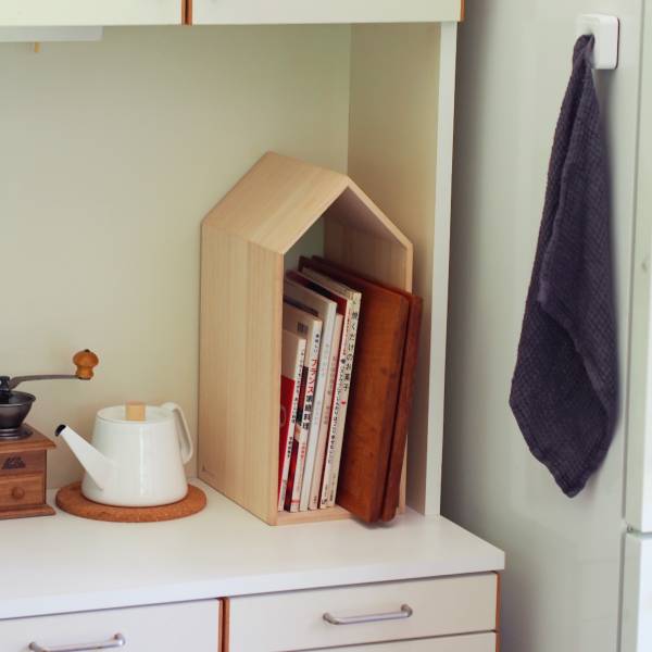 最近は手軽にスマホでレシピも検索できるので、レシピ本はだいぶ処分しました。どうしても残しておきたいものだけ、こちらの一番大きいサイズのブックハウスを使い収納しています。トレー置き場にも丁度良く、上に屋根があるので、埃もたまらないので気に入っています。