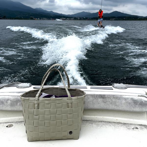 お重がすっぽり入る、底広サイズのバッグ。運動会やピクニックにぴったり!濡れても汚れてもサッと拭けるから、プールや海でも大活躍です。先日は山中湖でウェイクボード体験。風が気持ちよくて最高だったけど、腕はぷるぷるに…15分で短いと思っていたけど、十分でした(笑)