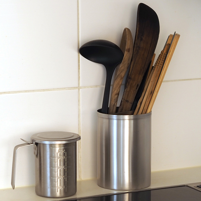 ツールスタンドって、ぱっと取る時にスタンドごとグラっとすることありませんか?それは、底の方でツール同士が絡まり合ったりしているから。家事問屋のツールスタンドは、間口が広く入れやすいのに、仕切りがついているので、絡まらりづらいんです。頭でっかちなお玉やヘラを入れても安定感があり、指紋や汚れが目立ちにくいヘアーライン仕上げなのも気に入ってます。