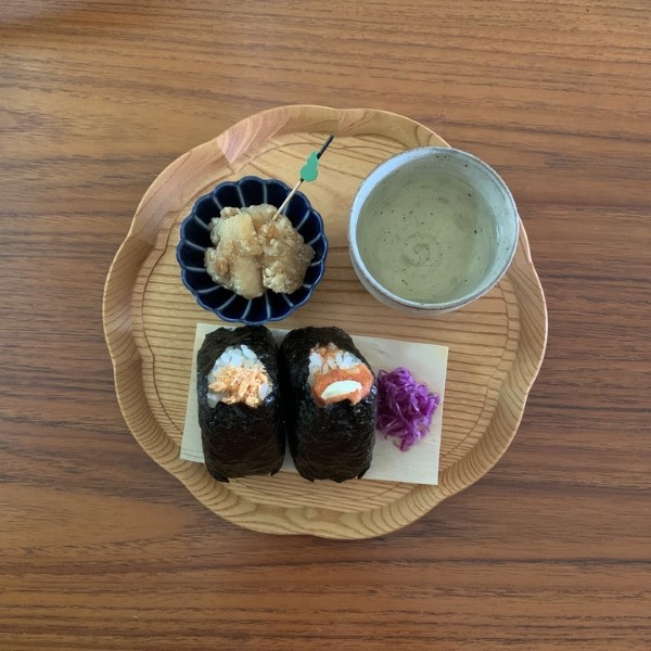 おひとり様ランチの風景をパチリ。実はかなりお腹がぺっこぺこで、今すぐにでも頬張りたい気持ちをぐっとこらえての一枚です(笑)。この日のメインは、大好きなおにぎり屋さんのおにぎり。せっかくならと選んだのは、四十沢木材工芸さんの輪花盆(中サイズ)でした。経木にのせたおにぎりを2つ、そして高確率で一緒に売られている唐揚げも添えて。なんて事のないメニューも、お盆にのせるだけで“とっても美味しそう”に見える魔法。ひと手間の大切さを噛みしめながら、いただきます。