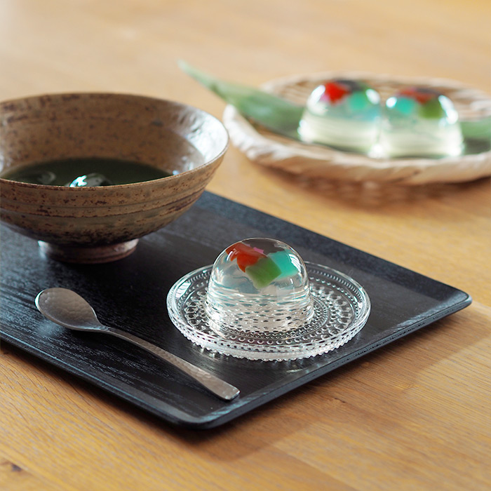 日ごとに日差しが強くなってきました。そんな時には「目から涼」で涼しさを演出。日本橋の和菓子屋さんで見つけたゆらゆら揺れる金魚が可愛い冷菓子とこちらもひんやり冷たい抹茶を用意しました。おやつセットにちょうど良いサイズのこちらのプレート。黒いプレートの額縁効果でおもてなしにもぴったりです。丼ごはんの時にもちょうど良いサイズ感です。