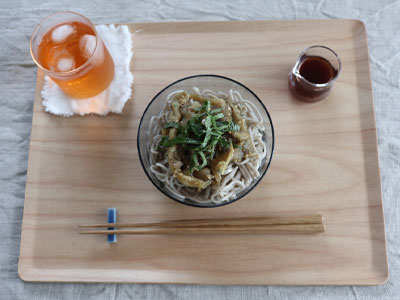 暑い夏には簡単でおいしい焼きナスを乗せた冷やしぶっかけ蕎麦。 このトレイは通常のランチョンマットと同じくらいの大きさなので、家族人数分揃えてもちゃんと食卓に置けるので場所も取りません。
