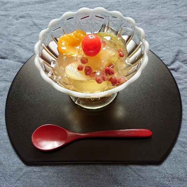 夏になると食べたくなる豆寒天。少しでも涼しさを味わいたくて選んだ器はカステヘルミです。朝露のしずくをイメージしたガラスの粒々が日に当たるとキラキラして寒天をよりひんやりと感じさせてくれます。合わせたカトラリーは柳宗理のティースプーンです。我が家ではヨーグルト、プリン、アイスとデザート用に愛用しています。和菓子系のデザートの時には半月盆があると一気にお店感が出るのでお勧めです。