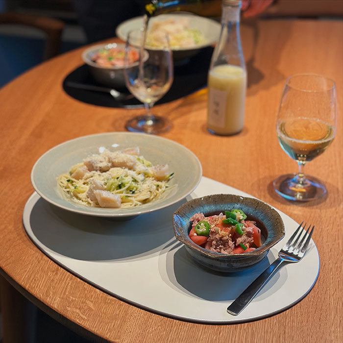 小判盆を一枚置く事でテーブルコーディネートが一気に引き締まります。しかも赤と黒のリバーシブルなので一挙両得。料理やお酒をゆっくりと楽しみたい時は、一皿を潔く置いたり、余白を活かす盛り付けを試してみてください。小判盆に合わせたのは飯高幸作さんの「オーバル皿 白フチ茶」。相性の良いサイズ感と、和食でも洋食でもどんな国のお料理もオシャレに盛り付けられるのが飯高作品のオススメポイント。ちなみに盛り付けたのはスーパーで買ってきた「サーモン寿司」にお醤油をたらしてバーナーで炙り、マヨネーズと酢橘を飾っただけ。