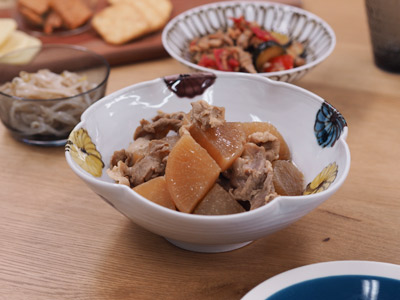 大皿料理が好きな私が一目惚れした鉢です。茶色一色の地味な煮物も散りばめられた花の絵柄がいい塩梅に際立たせてくれます。深さがあるので盛り付けも自然と高さがうまれ盛り付け上手になった気持ちになります。煮物鉢として我が家の定番皿に仲間入りです。