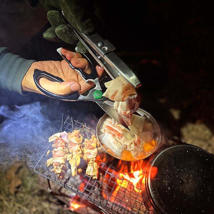 今まで使っていたキッチンバサミに不便さを感じていませんでしたが、単身赴任の夫に今までのハサミを譲り、憧れのエーデルワイスを迎え入れました。まず捕まえたら逃がさない刃がすごい!また硬い昆布を重ねても大きめの持ち手で無理なくスパンッと切ることができます。その威力はキャンプ場でも発揮。屋内でも屋外でも大活躍!20年愛用しているスタッフ石田は先日木屋さんへ研ぎ直しに出したところ切れ味が更に良くなったとのこと。一生物のキッチンバサミ、大切に使っていきたいと思います。