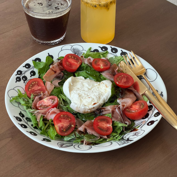ARABIAの名作「Paratiisi」26cmプレート、やっぱり素敵なんです。北欧らしいモノトーンの花模様が、ほどよい存在感でテーブルをおしゃれに見せてくれます。サイズもちょうどいい大きさで、料理をしっかりのせても余白がきれいに残って、見た目もバランスばっちり。派手すぎないデザインだから、どんなお料理にも合うし、盛りつけた瞬間に「美味しそう!」ってなります。ブランチの時によく使う、お気に入りのワンプレート皿です。