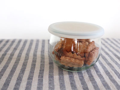 全粒粉のザクザククッキーをたくさん作って、ウェックの容器に。ザクザク感を保つには、このシリコンキャップで保存するのが手軽で効果的!クッキーやスナック菓子の保存用としてどの蓋がいいかは、WECK公式サイト「WECKしてみた」でも検証されてますので、ぜひ見てみてくださいね。