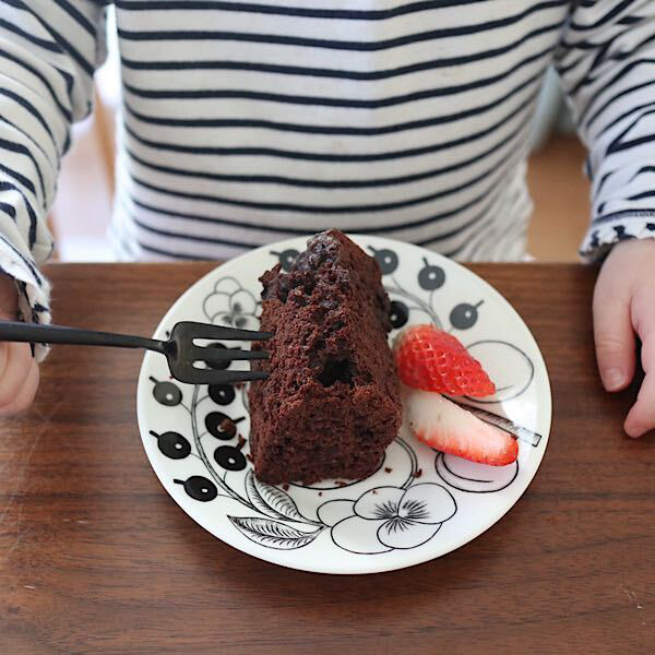私のお気に入りの組み合わせ、ARABIAのブラックパラティッシのプレートとムーンマットブラックのカトラリー。この日は手作りしたチョコレートケーキを載せてみました。このペストリーフォークはデザートフォークよりも少し短めで先端もシュッとすぼまっているデザインなのでケーキやフルーツを差しやすいんです。2歳の娘にも持ちやすいサイズで我が家ではおやつの時間によく使っています。デザートフォークとは別にこのフォークがあると重宝しますよ。
