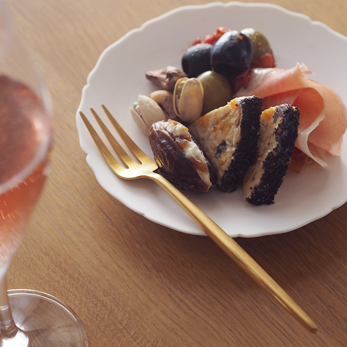 今宵のおつまみはいつものミックスナッツではなく、好きなものちょこちょこの盛り合わせ。少しオシャレに特別感を演出したい時に手に取るのはゴールドのカトラリーです。クチポールのペストリーフォークは私好みのサイズ感。またフォークの先端がシュッとして長めで刺しやすく、ケーキやフルーツ程度の固さのものでしたら先端部分でカットできます。ペストリーフォークのみクチポールの様々なシリーズを持っていまして、器に合わせて使い分けています。