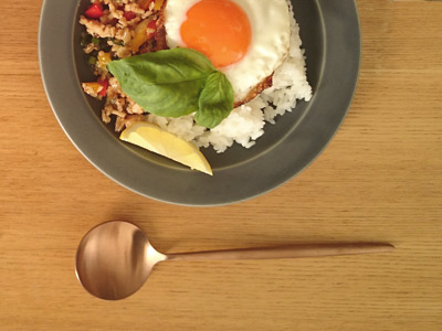 形に一目惚れしてお迎えしたテーブルスプーン。ほっそりした柄にアンバランスなすくう部分。やっぱり可愛い♪今回はスプーンですくう系飯で人気のガパオライスを食べました!ここだけの話、私は一口がだいぶ大きいので、がっつり食べられるテーブルスプーンが気にいっているのですが、女性の方やお子様はデザートスプーンくらいの方が大きすぎず品良く食事が出来るかも!