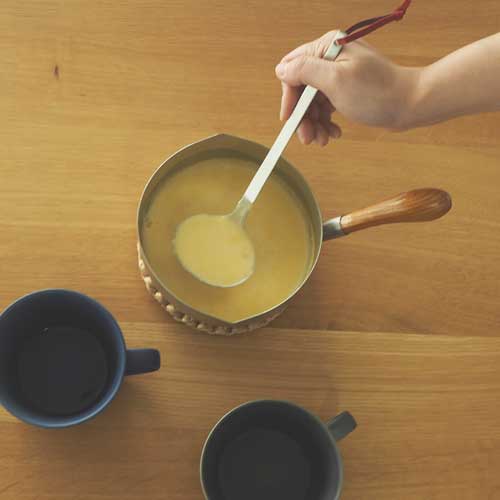 工房アイザワの両口付ミルクパンは、木製のハンドルはゆるやかにカーブをしていて握りやすく、動物のしっぽのような見た目がとてもかわいいです。スープの温め直しやホットミルク、ロイヤルミルクティーやチャイなどをつくるときに使っています。お弁当や付け合わせの茹で野菜をつくるときも少量のお湯で茹でられるので無駄がありません。お気に入りの道具を使うとお料理がより楽しくなりますね。